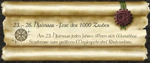 Am 23. Hjalmaar eines jeden Jahres, wenn in anderen Städten Rhejvandars die Erntefeierlichkeiten bereits beendet wurden, beginnt in Wunabba das Fest der tausend Zauber. Nur während dieser Zeit öffnet die Stadt, zu der in der Regel ausschließlich magisch begabte Rhejvandari Zutritt erhalten, ihre Tore auch für die normale Bevölkerung und lädt zu einem der größten Magiespektakel der Welt ein. Der Alltag der Hexenmeister und -lehrlinge sieht ein konzentriertes Studium vor, welches wenig Abwechslung und Freizeit lässt. Sobald jedoch die Vorbereitungen zum Fest beginnen, vergessen alle Bewohner ihren herkömmlichen Lebensrhythmus und die sonst so ruhige Stadt erwacht zum Leben. Zauberkundige aus aller Welt kommen extra zu diesem Ereignis nach Wunabba, um dort miteinander zu feiern und in Magiewettstreiten ihr Können unter Beweis zu stellen. Überall in der Stadt, die während dieser vier Tage einem riesigen Jahrmarkt gleicht, haben Magier, Gaukler und Wahrsager ihre Zelte aufgeschlagen. In den unzähligen Buden, die sich wie bunte Ketten durch die Straßen und Plätze ziehen, werden die absonderlichsten Dinge angeboten. Viele der Gäste nutzen das Fest, um Magiezutaten oder Relikte zu erwerben, denn zu keiner anderen Zeit und an keinem anderen Ort findet man so viele seltene Dinge auf einem Haufen und zu so günstigen Preisen.